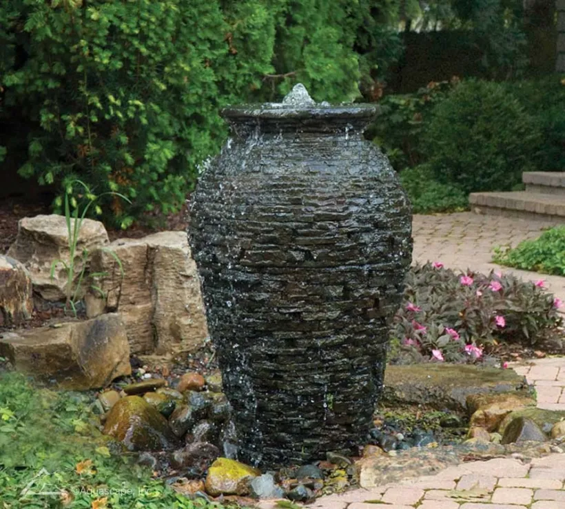 Creates an impressive, natural-looking fountain Lightweight, durable fiber-resin composite construction Ideal for a wide variety of installation locations Plumbing included for quick and easy installation.Enjoy the sight and sound of water gently dancing down an impressive, stacked slate urn fountain that looks like real stone. This beautiful urn can be installed as a fountain atop a sub-surface Aquascape AquaBasin(sold separately), or it can be added to a pond or waterfall for a truly unique landscape element. The lightweight, durable fiber-resin composite construction looks amazingly like real stone but is less expensive.Stacked Slate Urn is ideal for a wide variety of installations and locations. A section of tubing is included for quick and easy installation. Real basalt is extremely heavy and can be difficult to install. Due to the lightweight nature of the faux basalts, installation is quick and easy. Each column provides a convenient base, making it easy to secure in place using decorative gravel. The included tubing and plumbing fitting install easily into the recessed area at the top of the fountain.